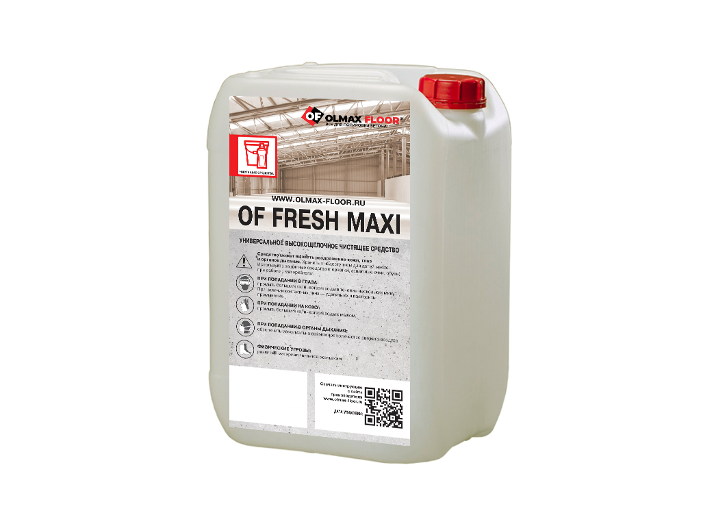OF Fresh Maxi (Фреш Макси) – высоко-щелочной очиститель для удаления типичных для промышленных объектов масляных и жировых загрязнений, в том числе застарелых и глубоко въевшихся. Обеспечивает быстрое их растворение, способствуя сокращению времени уборки.