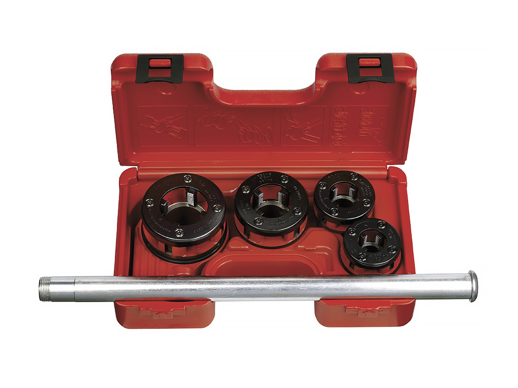 В набор входит клупп с трещоткой с неразборной рукояткой, резьбонарезные головки 1/2 – 3/4– 1 – 1.1/4", пластмассовый чемодан.